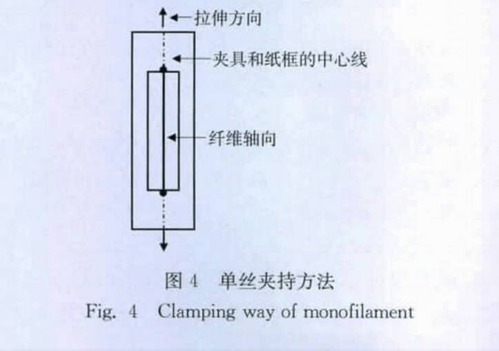 夾持試樣時,試樣與夾具不要有偏離,先固定上夾具,位置正確后再固定下夾具。夾具不要碰到,更不要夾到纖維與紙框的粘結(jié)點處,以免損傷纖維,如圖4所示,要保證單絲軸向、夾具和紙框的中心線和拉伸方向重合。