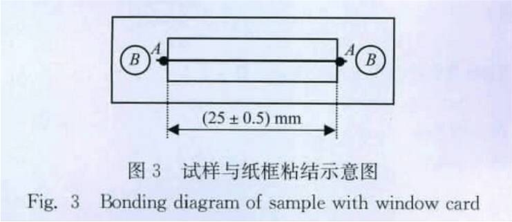 用有一定強度的紙,如坐標(biāo)紙,刻出如圖3所示的紙框,紙框的間距為(25±0.5)mm,其寬度與總長度根據(jù)拉力機夾持器的尺寸來定,并保證用鑷子夾取時紙框不發(fā)生變形。圖3中A為纖維與紙框粘結(jié)處,B為拉力機夾持處。